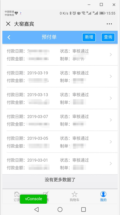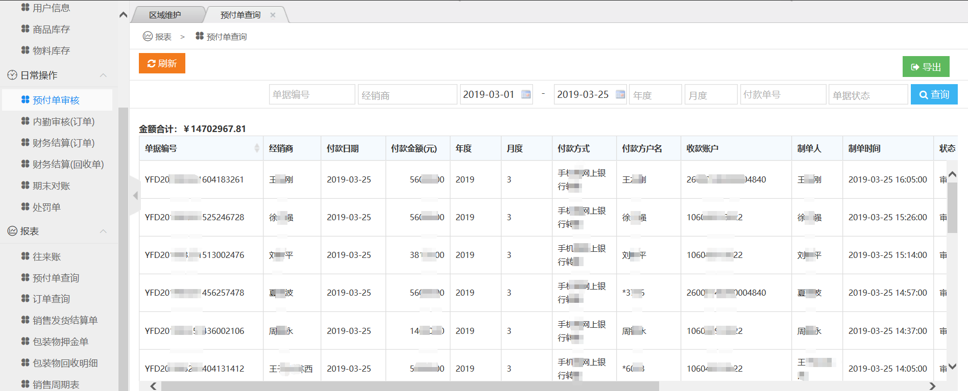 电脑后台,有相应权限的用户,可以查看、审核经销商提交的预付单信息。