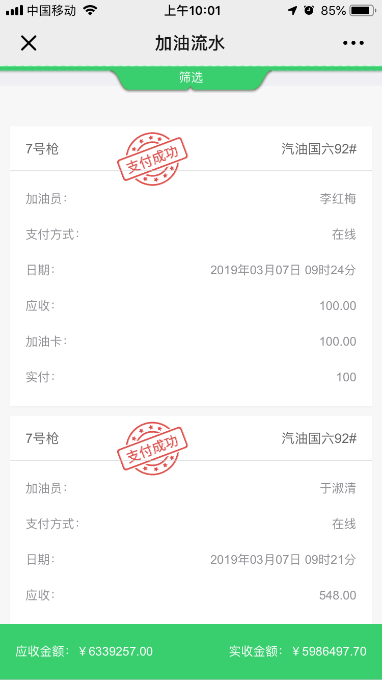 以加油员微信号来确认身份,生成二维码收费;这种方式提高了收款效率,同时解决了交班对账难的问题;交班时,站长只要确认加油员名下所有收款、优惠之和等于加油机使用的油卡金额即可。
