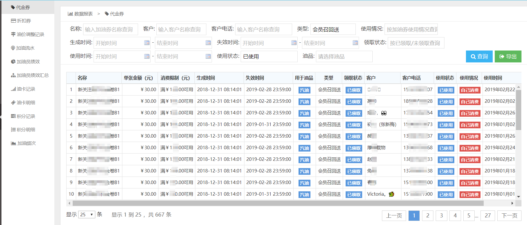 加油站站长可以在电脑端设备油品的价格;查看发入的代金券、查看加油员绩效、查看顾客的加油频次等等