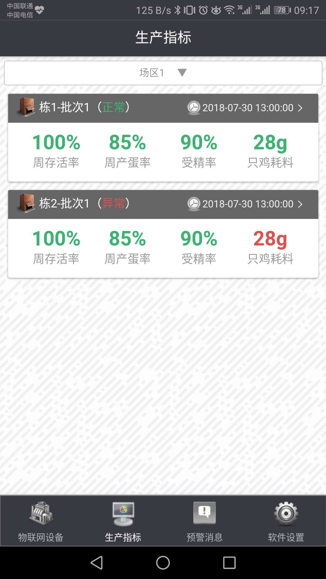 通过手机app对峪口禽业不同场区的鸡舍、孵化场等生产单位进行环境监控和生产指标监控,能通过app进行环境及生产指标异常预警、预警消息中心查看。
