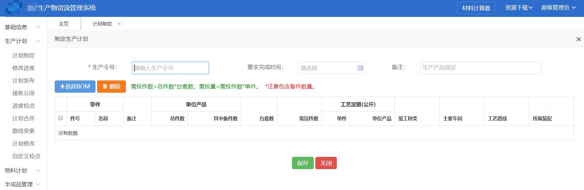 本系统用于管理生产流程。生产部依据销售部门的合同、生产bom表制定生产计划;生产计划按自定的审批流程进行审批;审批通过以后系统自动按bom中涉及的部门、车间将生产计划分发到各相关部门。物供部门依据生产计划与相应的库存安排采购及下料;生产车间依据生产计划、bom进行领料、生产加工;将加工好的成品或半成品交还到仓库;系统记录各部门的工作情况,采购、下料、生产、交回等,形成生产看板;时时反应生产计划进度情况。