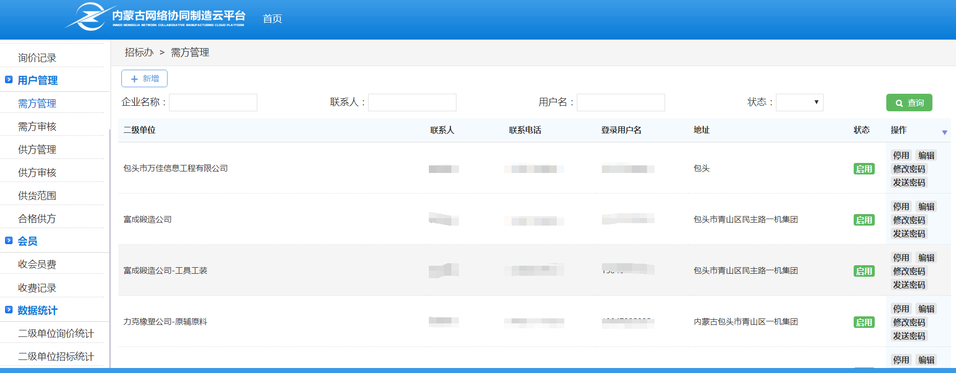 需方管理,由招标办人员添加需方帐户,并分配给二级单位。并可为二级单位提供修改、密码等服务。