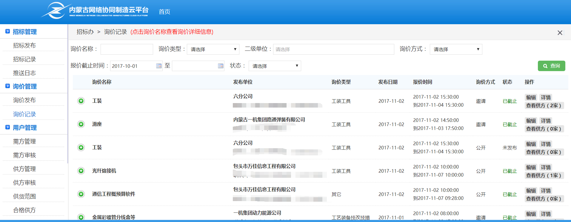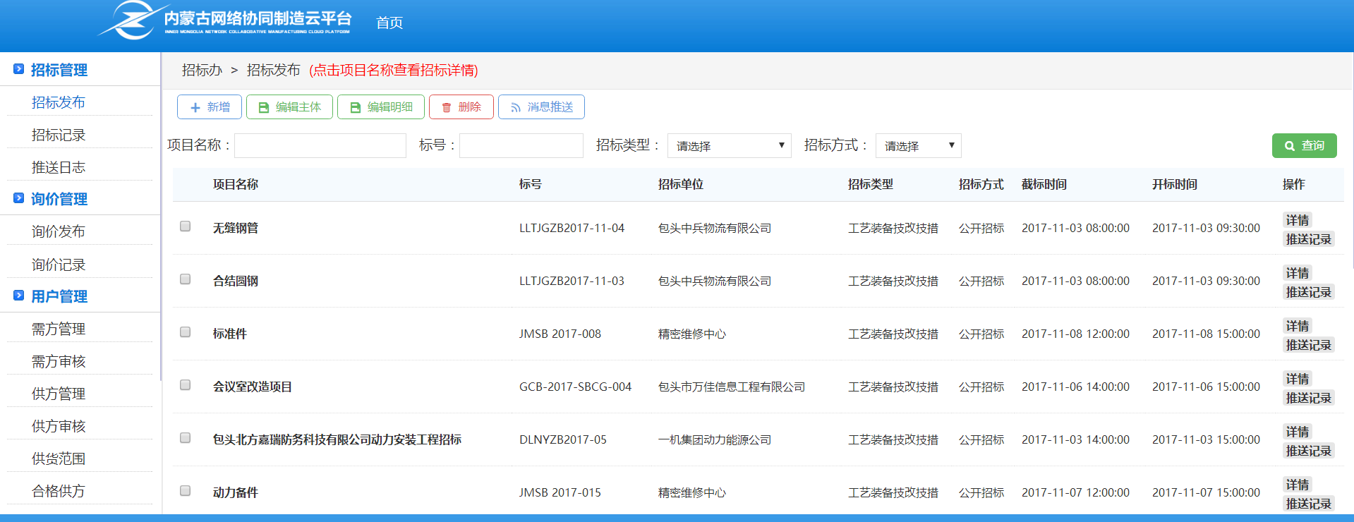 需方可以自己发招标、询价信息,招标办人员,可以代替需方发布招标、询价信息, 并可查看相关信息的所有记录