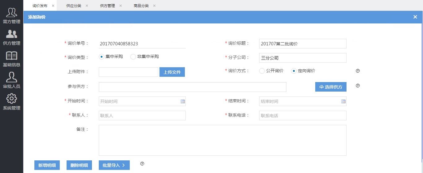 需方部门,或是管理部门进行发布询价信息,审核部门进行审批,供方进行报价,最后由需方或管理部门公布结果